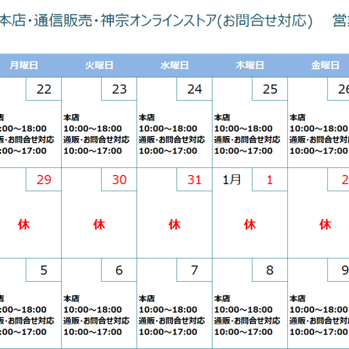 【淀屋橋本店・通信販売・神宗オンラインストア(お問合せ対応)】年末年始休業のお知らせ