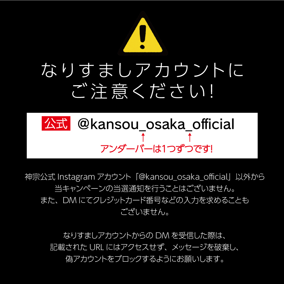 神宗公式Instagramアカウント(@kansou_osaka_official)以外から当選通知を行うことはございません。また、DMにてクレジットカード番号などの入力を求めることもございません。