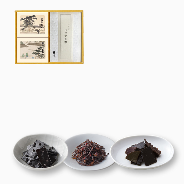 詰合せ内容:利尻塩昆布山椒入り 100g、細切り梅昆布 22g、竹の子昆布 200g
