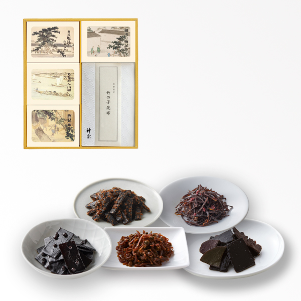 今が旬の春の味覚”竹の子昆布”と、神宗を代表する”利尻塩昆布山椒入り”や”ちりめん山椒”等のお詰合せです。